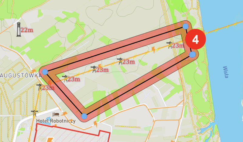 Narysuj trasę przelotu. O ile to możliwe, unikaj przelotu nad przeszkodami, gęstą zabudową, obszarami o dużej gęstości populacji oraz infrastrukturą. Pamiętaj, że rysowanie trasy możesz zakończyć klikając dwa razy w ostatni punkt. Można zakończyć rysowanie prawym przyciskiem myszy (4).
