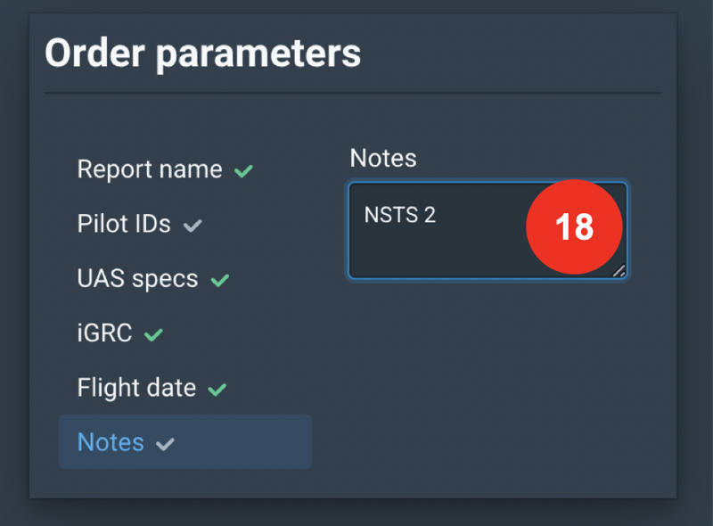 Notatki (18) – w tym polu możesz wpisać np. dokładny numer scenariusza według którego będziesz wykonywać lot. Np. NSTS 2. Możesz tutaj też wpisać dowolną rzecz, która pojawi się w preambule raportu a która jest istotna dla lotu.