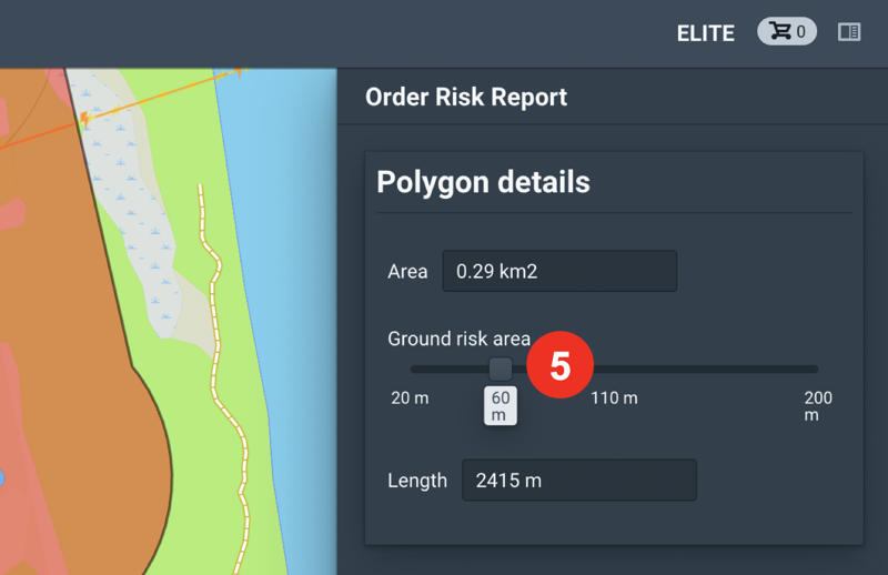 Określnie buforu bezpieczeństwa. To ważny element przygotowania. Zakłada się, że promień bufora jest równy deklarowanej wysokości lotu. Pamiętaj, że im szerszy promień bufora bezpieczeństwa tym więcej analizy będziesz musiał/-a wykonać. Szerszy bufor bezpieczeństwa może zwiększyć Twoje iGRC związany z gęstością populacji. Ale, im szerszy bufor bezpieczeństwa tym otrzymujesz w raporcie więcej informacji o przeszkodach i ukształtowaniu powierzchni (terenu), która potencjalnie może zwiększać ryzyko kolizji. Ocena jak szeroki powinien być bufor bezpieczeństwa zależy od Ciebie. Zrób to z głową. Szerokość bufora, określasz suwaczkiem (5)