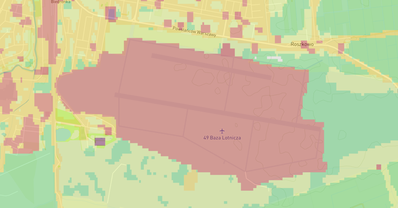 Statyczna mapa wykorzystująca informacje statyczne. Klasyfikacja gęstości populacji jest zgodna z podziałem zawartym w dokumencie źródłowym dla EASA (JARUS Annex F) i wyskalowana jest w liczbie populacji na 1km2. Uwaga! w naszej opinii zaproponowany oficjalnie podział populacji jest niedoskonały i wymaga doszczegółowienia. Aktualnie trwają prace nad oficjalną aktualizacją wymagań. Informacja o gęstości populacji pojawia się od pewnego poziomu zbliżenia mapy (zoomu).